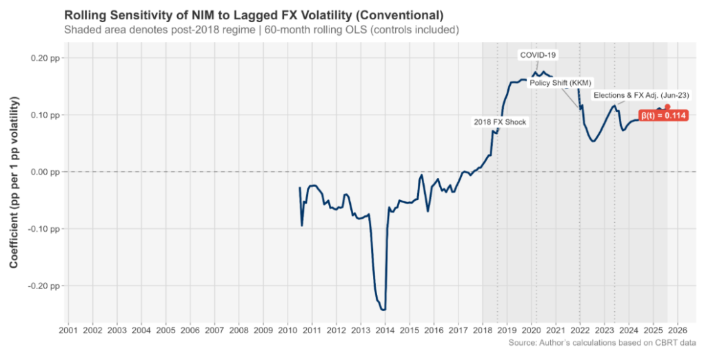 Before 2018, the relationship between FX volatility and NIM for conventional banks appears almost flat — volatility had a limited impact on margins.