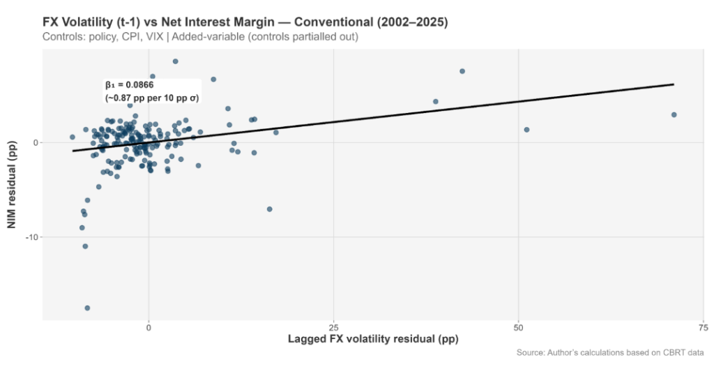 According to the interpretation provided by Hayat Finans, this may reflect the income structure and product logic of participation banking — including profit-sharing mechanisms, regulatory frameworks, and specific adjustment channels compared with interest-based models — leading to a stronger margin response to volatility shocks.