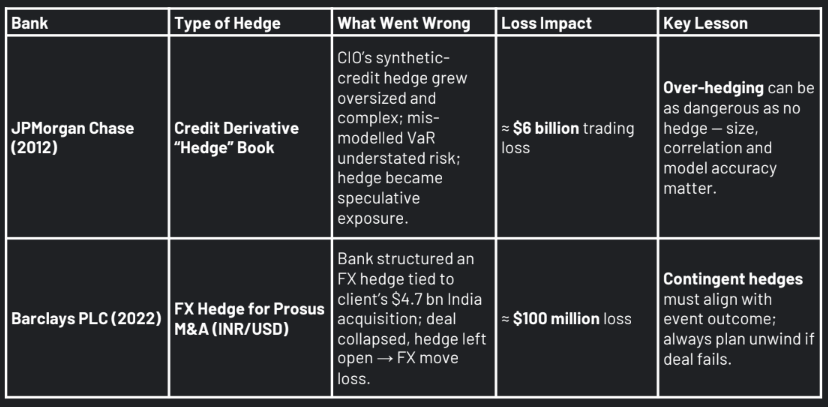 - JPMorgan (2012): кредитная «хедж-книга» стала слишком большой и сложной; неправильно смоделированный VaR занижал риск, и хедж фактически превратился в спекулятивную экспозицию. Итог ー около $6 млрд торгового убытка. Ключевой вывод: over-hedging может быть так же опасен, как отсутствие хеджа.