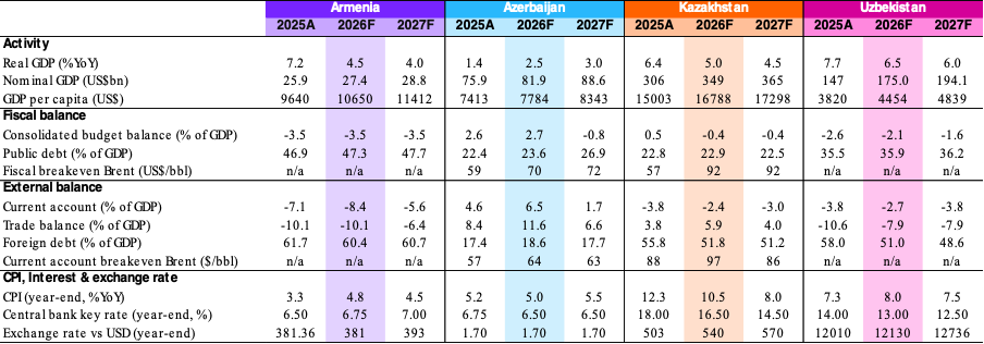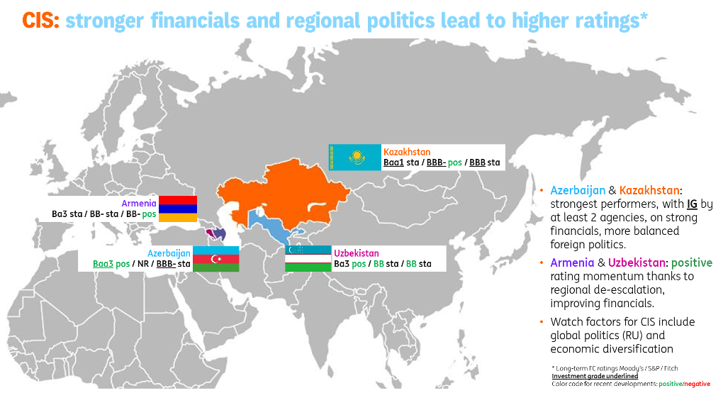 ●  Казахстан получает поддержку через нефть, но чувствителен к волатильности глобальных финансовых потоков;