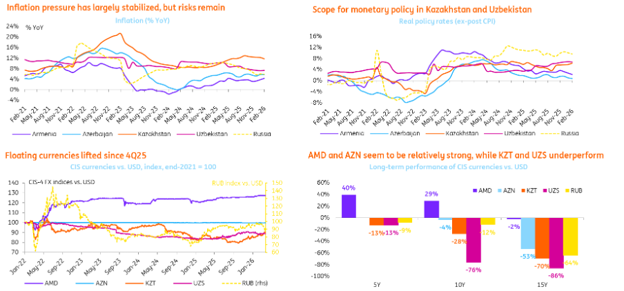 Для нефтяных экспортеров региона — Казахстана и Азербайджана — это означает краткосрочное улучшение внешних показателей. По оценкам ING, устойчивый рост цены нефти на $10 за баррель может добавлять около $6 млрд к годовому экспорту Казахстана и $3 млрд к экспорту Азербайджана (примерно 1,8% и 4,0% ВВП соответственно). Фискальный эффект также положительный: такие изменения цен могут приносить около $1,5 млрд дополнительных нефтяных доходов бюджета в каждой из стран.