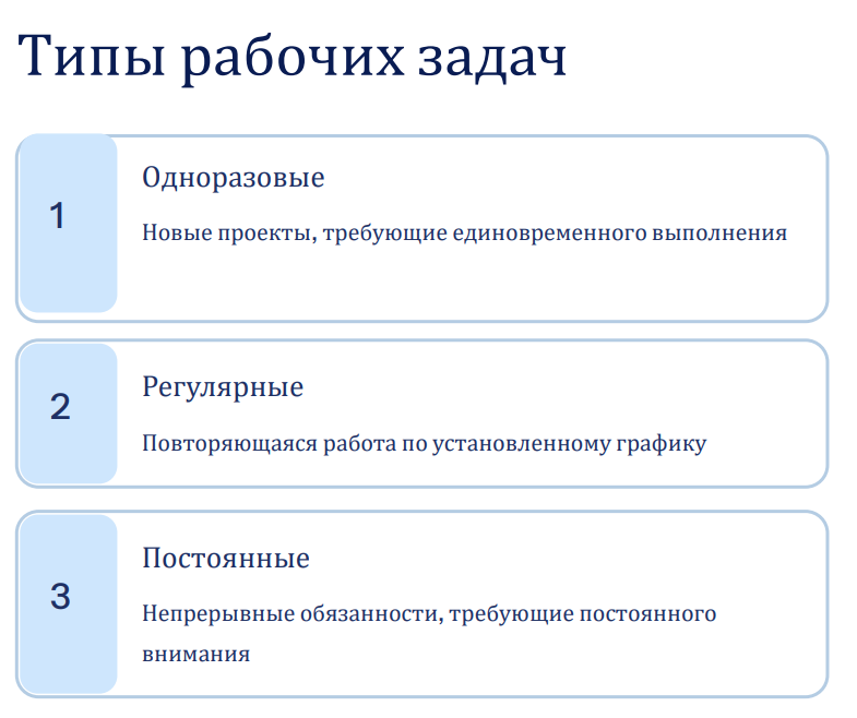 Рабочие задачи условно можно разделить на одноразовые, регулярные и постоянные. Такое разграничение помогает увидеть, куда уходит внимание: на стратегию или на поток мелочей, которые каждый день требуют «только пять минут», но после них почему-то куда-то исчезают целые часы.