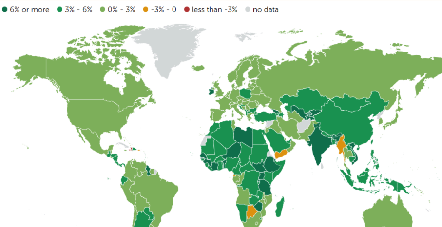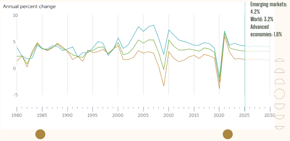 На данный момент развитые страны входят в период смягчения денежно-кредитной политики (ожидается снижение ставок). Главной неопределенностью остается динамика мирового роста: прогнозы указывают на его ослабление, в том числе из-за тарифных факторов. Глобальные ожидания по темпам роста таковы: