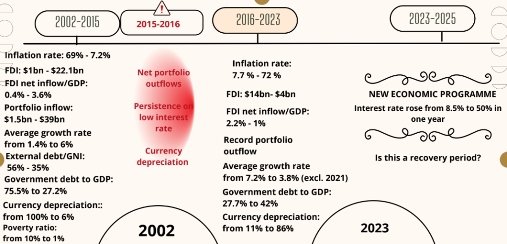 Далее наступил переломный момент. Период 2015–2016 и 2023 годов связан с экономическими ошибками и нетрадиционной политикой: агрессивное стремление к низким процентным ставкам при высокой инфляции, что противоречило экономическим основаниям. Параллельно усилилась политическая нестабильность, что дополнительно подорвало доверие инвесторов.
